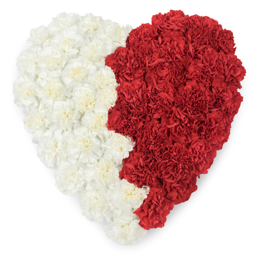 Celebrate love and sympathy with our beautifully crafted mixed carnations heart bouquet. This stunning arrangement features a harmonious blend of white and red carnations, each hand-selected for their exceptional quality and freshness.